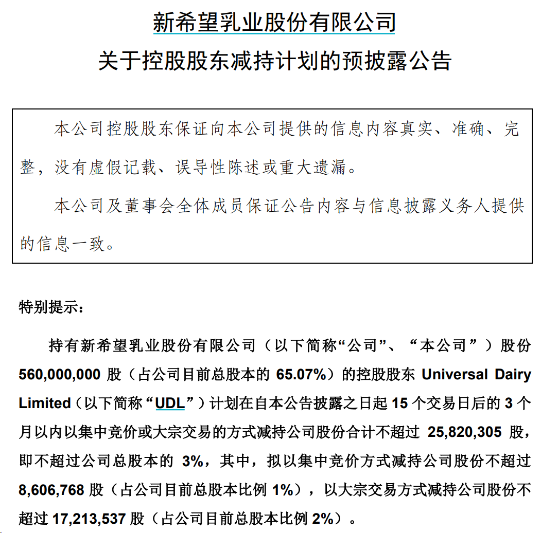 公告显示,作为新乳业控股股东的universal Dairy Limited(UDL),计划自公告披露之日起15个交易日后的三个月内减持不超过2582.03万股,占总股本的3%。此次减持的特殊性在于,这是新乳业2019年上市以来,控股股东的首次减持。