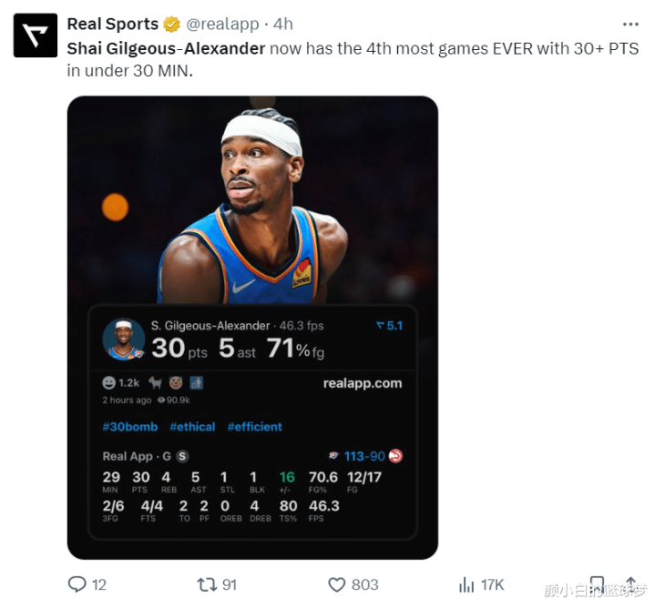 此役亚历山大30分钟不到拿到30+,他已经拿到NBA历史第四多的不足30分钟30+场次,亚历山大再度迎来里程碑。