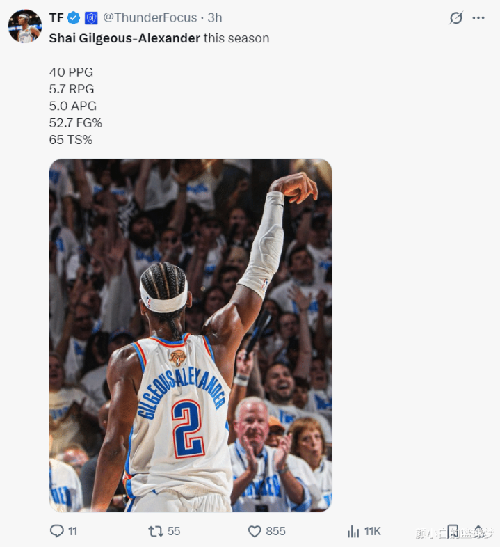 三场比赛亚历山大场均40.3分钟,拿到40分6篮板5助攻1.7抢断1.3盖帽,命中率52.7%,三分命中率22.7%,罚球命中率84.1%,真实命中率65%,雷霆拿到三连胜。